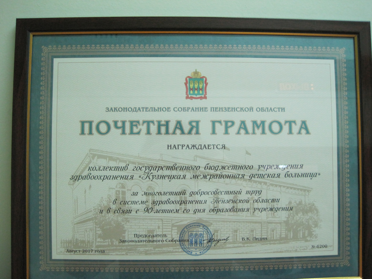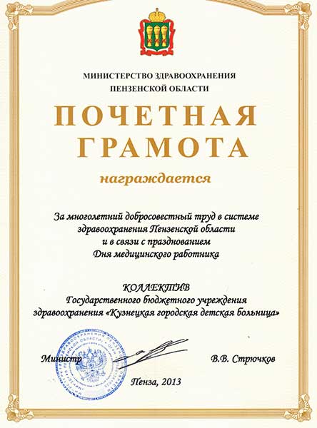 Почетная грамота Минздрава Пензенской области