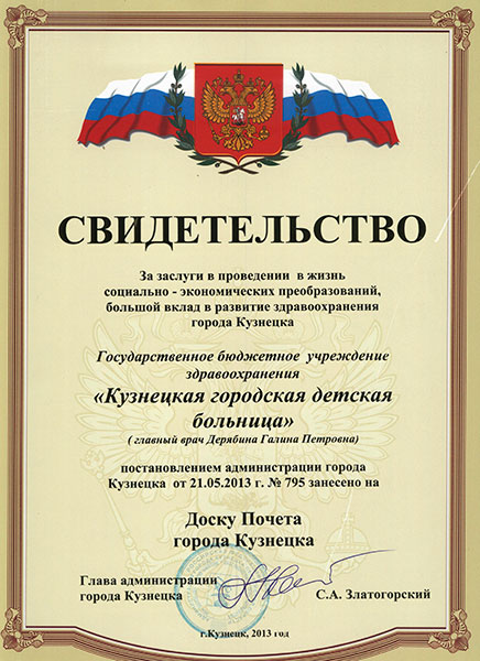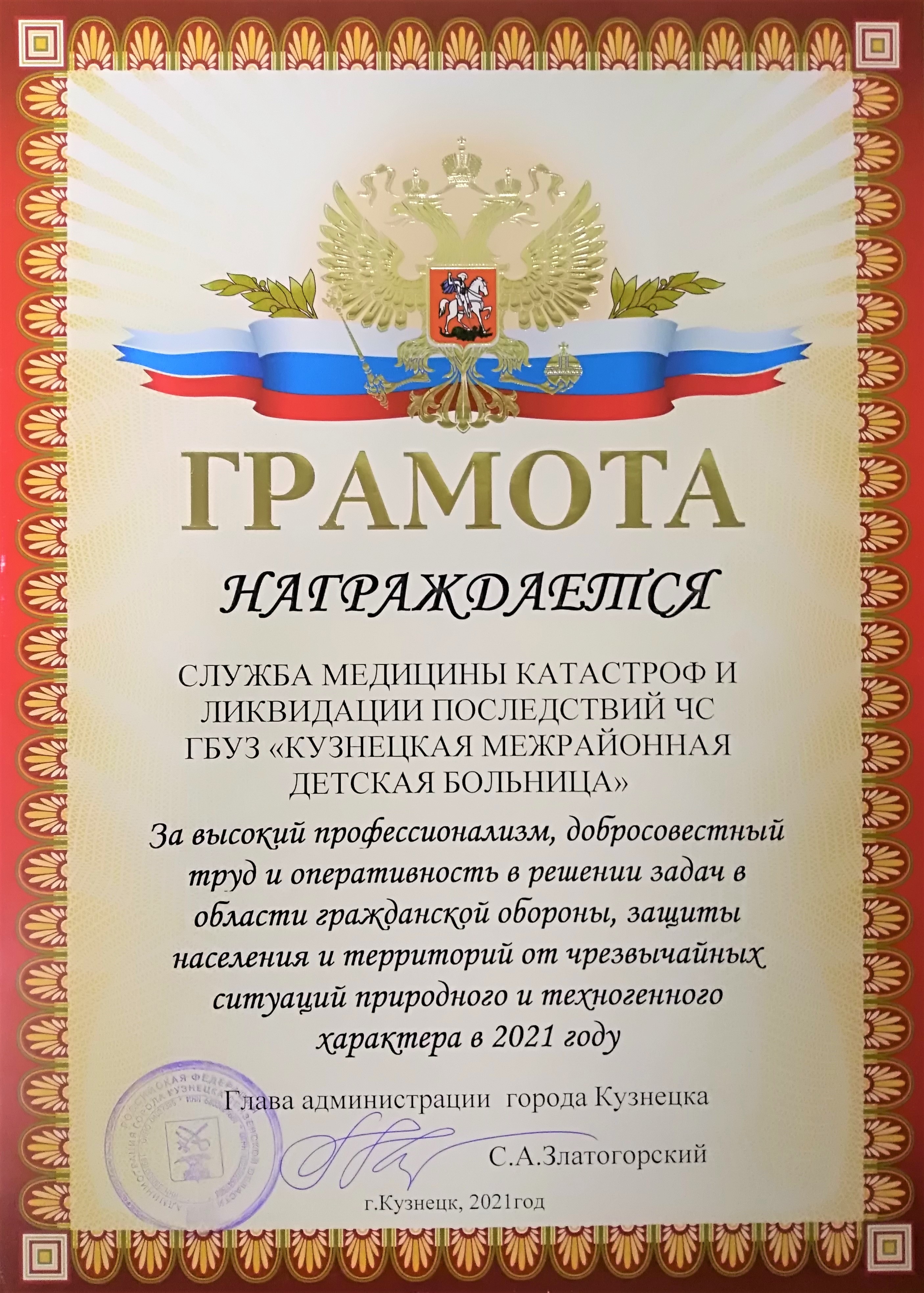 Почетная грамота Главы администрации города Кузнецка С.А. Златогорский