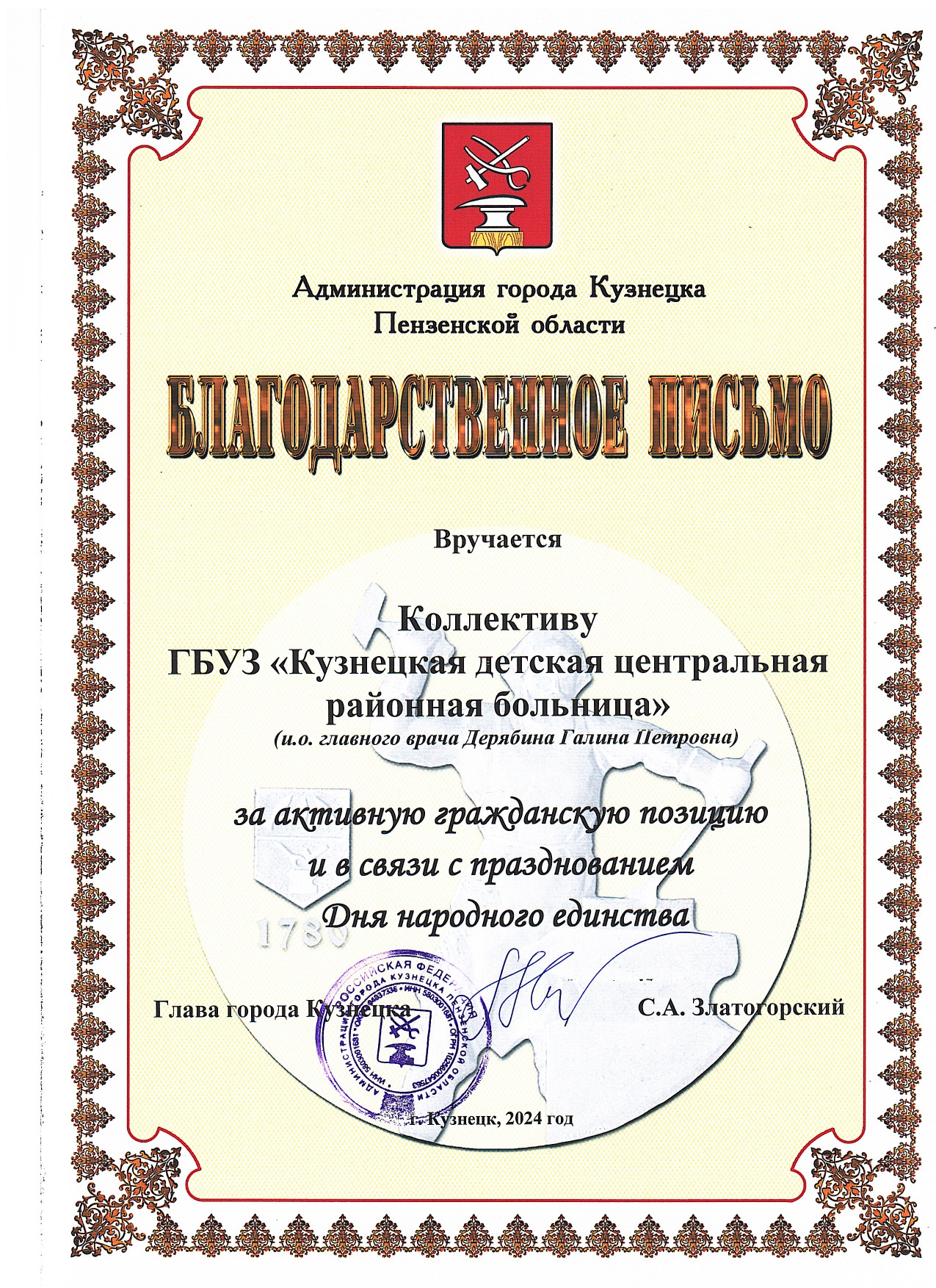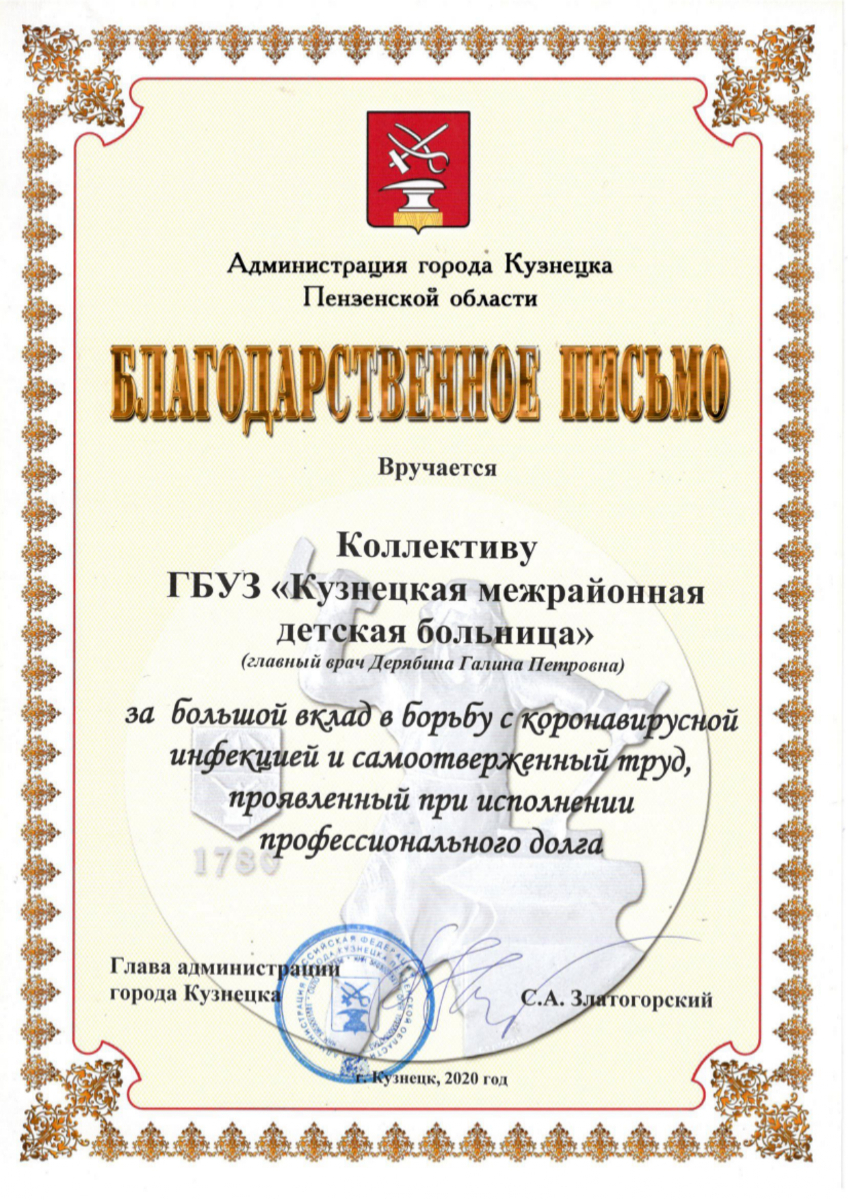 Благодарственное письмо Главы администрации города Кузнецка С.А. Златогорский