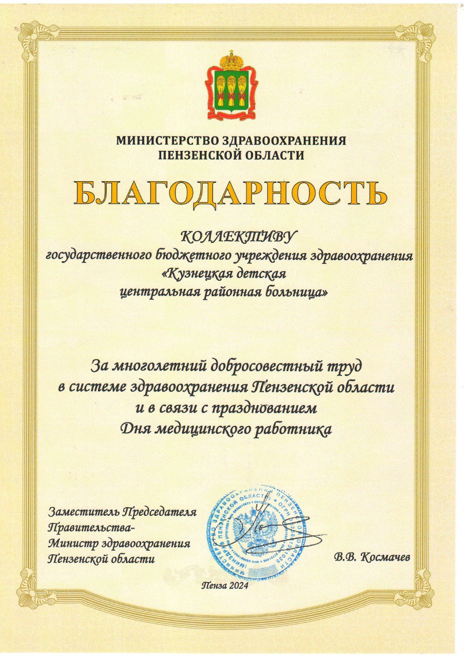 Благодарность Минздрава Пензенской области